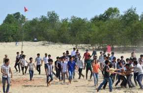 Chiều về, bến sông càng tấp nập, những cô gái làng với đôi quang gánh trĩu nặng trên vai, những chiếc xuồng mang chắt chắt cào được trong ngày về bến. Đằng kia là đàn trâu thong thả bơi sau một ngày gặm cỏ.