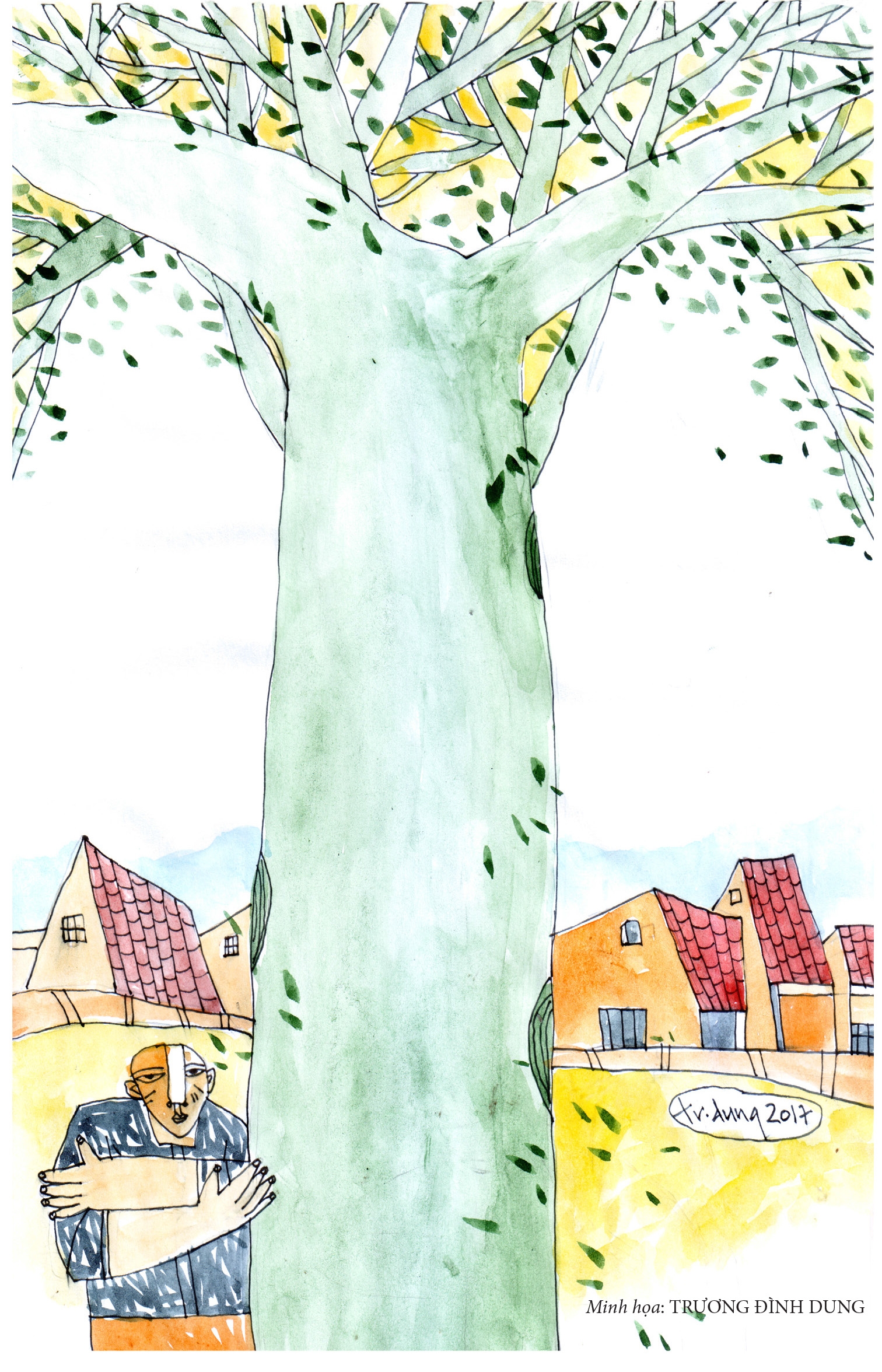 Năm ấy tôi còn quá nhỏ, chẳng biết chi nhiều. Sáng hôm đó, người làng nghỉ buổi chợ, cũng không ai đi ra đồng, đám con nít thì muộn học, tất cả tập trung quanh gốc bông gòn khi nghe tin có người treo cổ. Cây bông gòn nằm đó đã lâu. Chừ hỏi ông mệ già nhất trong làng, cũng không ai nhớ cây có chính xác từ năm mô. Qua bom đạn và mấy mùa bão lũ, cây có lúc nghiêng ngả, cành lá gãy gọn. Tưởng đã chết đi thế mà vẫn sống, gốc rễ bám sâu vào đất không dễ chi tách rời. Cành lá chắc chắn, vòng cây to hai người ôm không xuể.